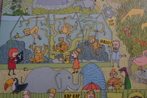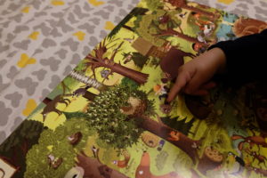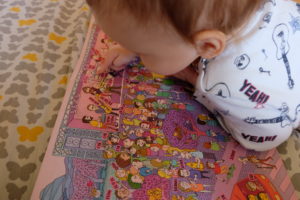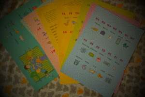 Do książki dołączone są karty-wkładki z obrazkami – „wyjętymi” z ilustracji oraz sylabami, rzeczownikami i krótkimi tekstami do czytania dla dzieci i przez dzieci, ułożone zgodnie z zasadami programowania języka. Dzięki tym małym obrazeczkom, możemy ćwiczyć spostrzegawczość, na zasadzie „odnajdź na ilustracji ten fragment”. Może niektórzy z Was pamiętają, gdzie jest Wally?- no właśnie, tak to działa 🙂